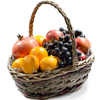 В корзине: апельсин 6 шт., гранат, гроздь винограда, яблоки 3 штуки.