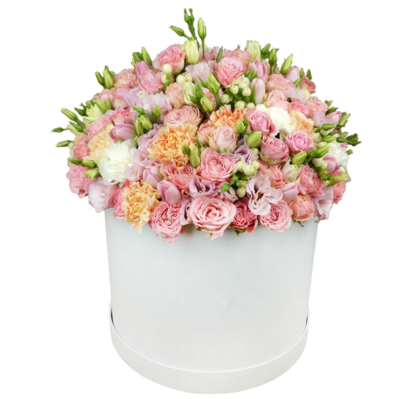 Букет состоит из 10 кустовых пионовидных роз, 8 веток эустомы, 13 гвоздик, 16 тюльпанов, 7 гиперикум, коробка, оазис.