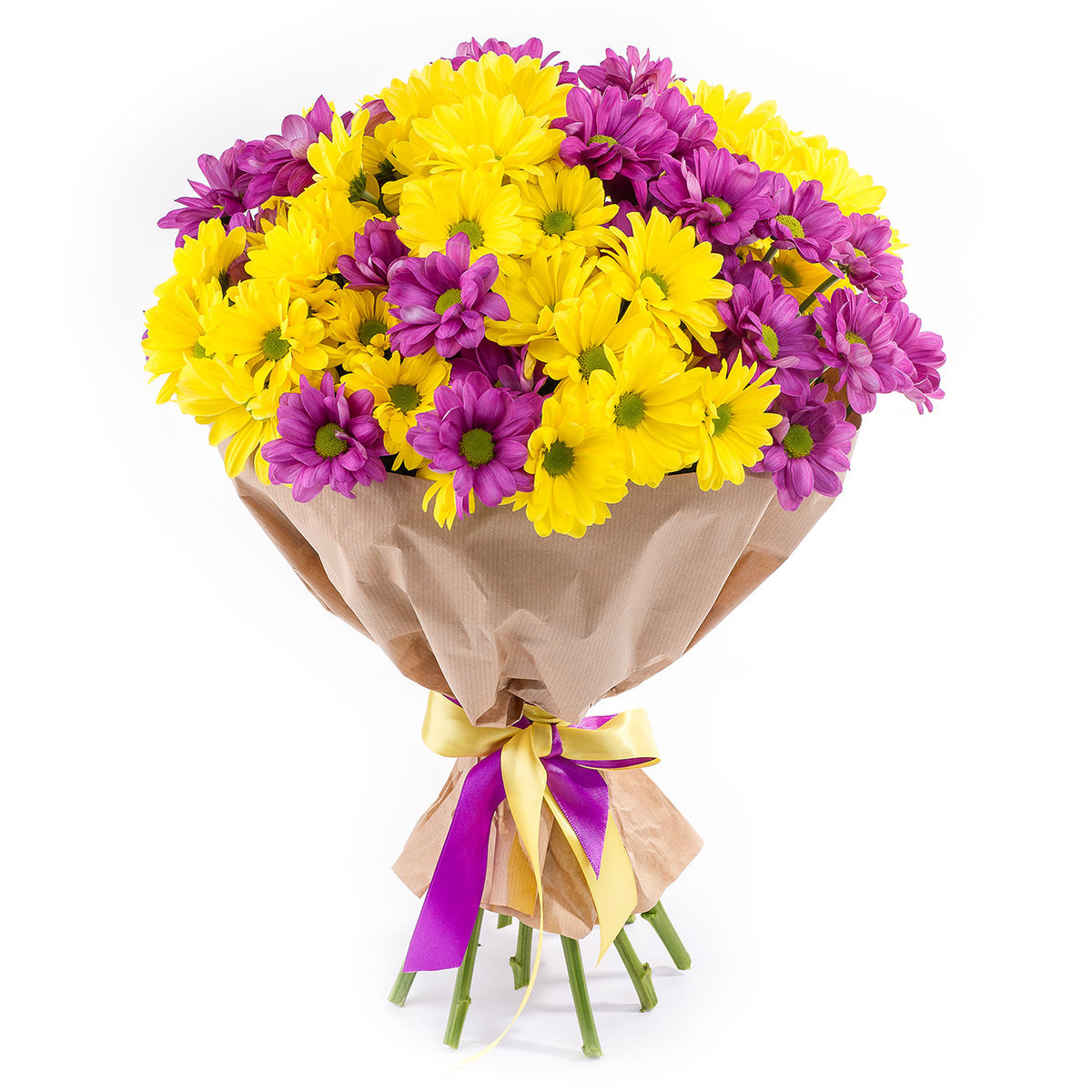 Букет состоит из 11 веток желтой и фиолетовой хризантемы, крафт, атласные ленты.