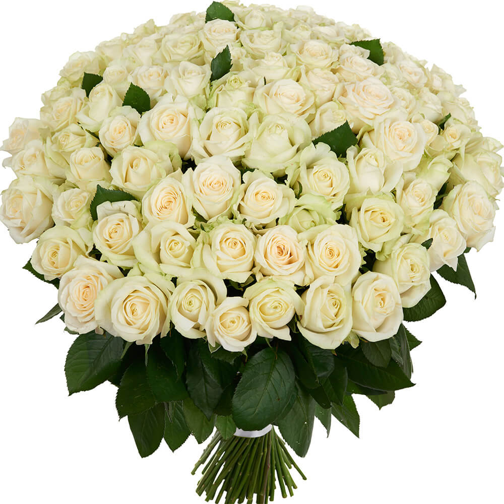 Букет состоит из 101 белая роза, прозрачная упаковка, белая лента.