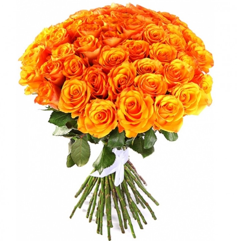 Букет состоит из 51 оранжевая роза, прозрачная упаковка, атласная лента.