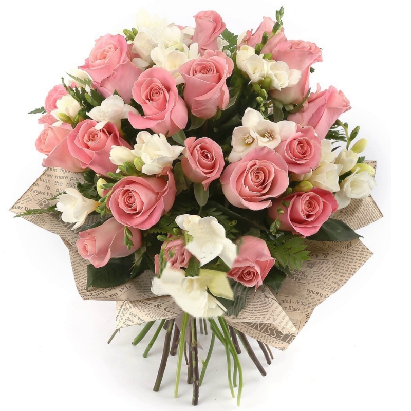 Букет состоит из 21 розовая роза, 6 белых фрезий, зелень, крафт, атласная лента.
